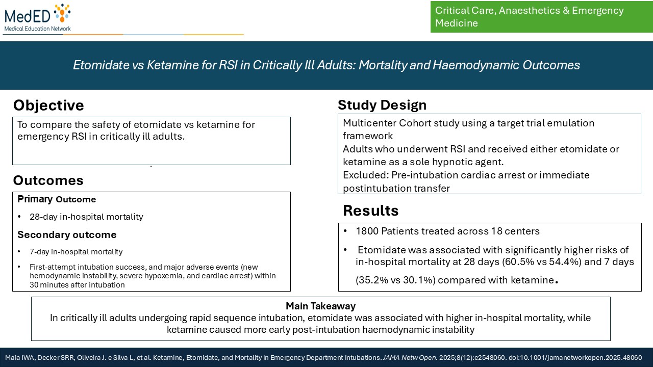 Study Objective: This recent study, published in JAMA Open Network in December 2025, aimed to compare the safety of etomidate versus ketamine as induction agents for emergency RSI in critically ill adults, focusing primarily on in-hospital mortality.
