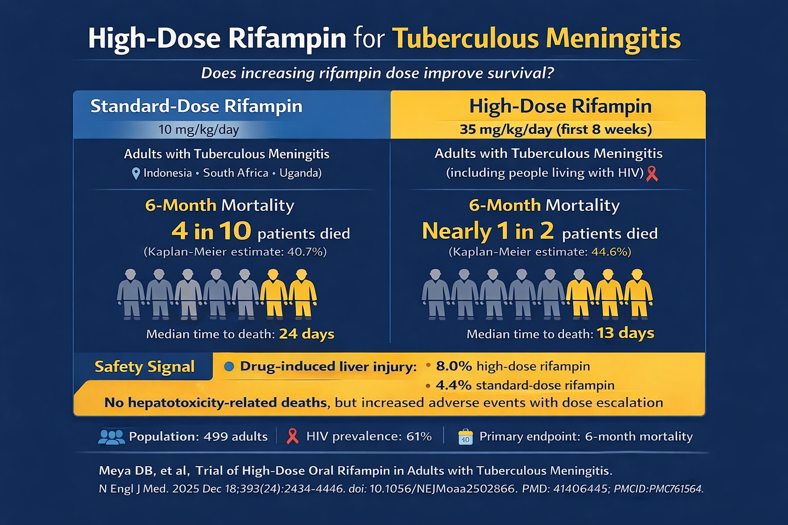 Escalating rifampin to 35 mg/kg daily provided no survival advantage in adult TBM patients. Mortality at 6 months remained comparable across both treatment groups (approximately 45% vs 41% in the high-dose and standard-dose arms, respectively), while hepatotoxicity nearly doubled with intensified therapy. In a cohort where 61% were HIV-positive, these findings underscore that rifampin monointensification is inadequate.
