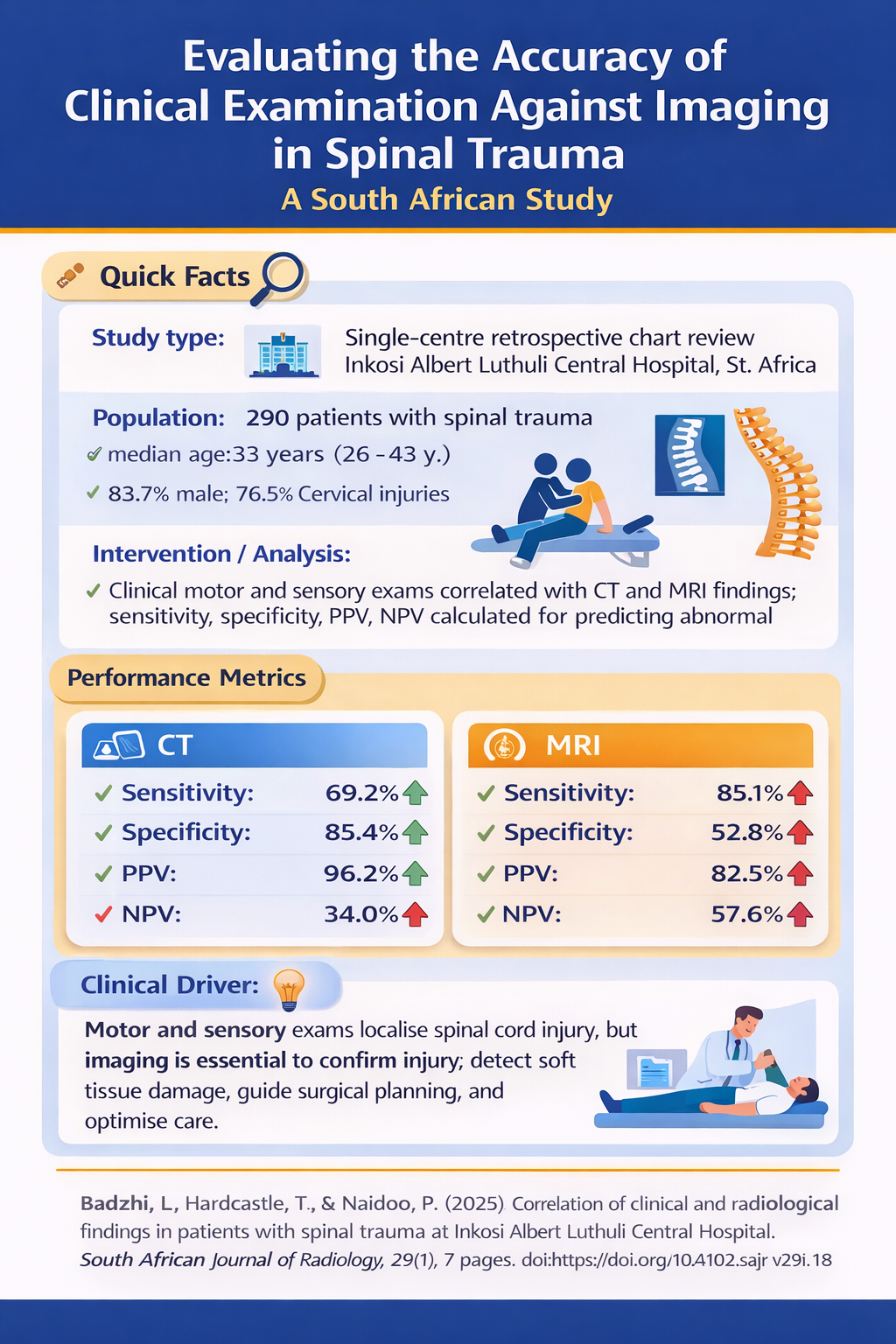 This retrospective chart review analysed 290 patients with spinal injuries admitted over six years (2018–2024) who received CT and/or MRI. Motor and sensory examination findings were compared against radiological results.